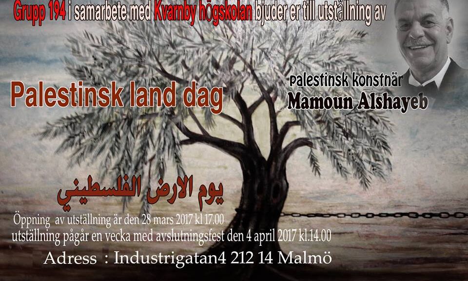 Grupp 194 بتعاون مع kvarnby högskolan تدعوكم لحضور الاحتفالية بيوم الأرض الفلسطيني ذلك يوم الثلاثاء الواقع في 28 آذار الساعة 17.00 الذي يستمر حتى 4 من نيسان بحفل ختام يحيه الفنان الفلسطيني مأمون الشهابي الساعة 14.00 العنوان :