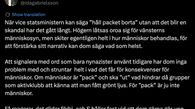 وحذّرت غابرييلسون من أن توصيف الناس بأنهم “حُثالة” والدعوة إلى “إبعادهم” يجرّدهم من إنسانيتهم، ويفتح المجال أمام مجموعات متطرفة مثل aktivklubbar للشعور بأنها حصلت على ضوء أخضر للتحرك، مشددة على أن نزع الصفة الإنسانية هو أخطر ما في هذا الخطاب.
