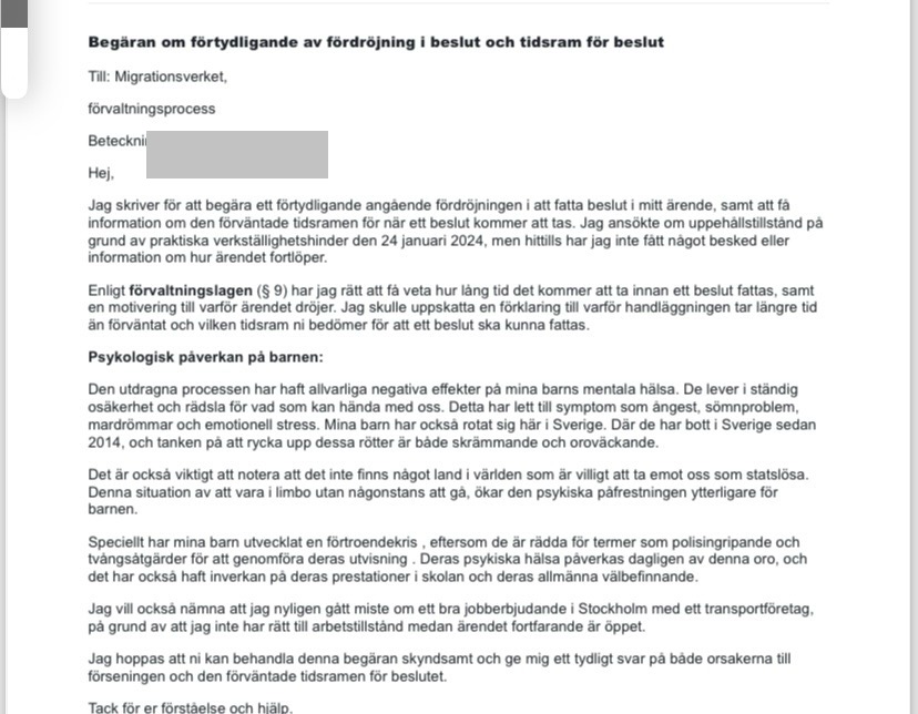 واجهت عائلة عمار كثيراً من المصاعب خلال وجودها في السويد، أهمها عدم الاستقرار والشعور بوجوب العودة خصوصاً عندما قال موظفو الهجرة ذلك بشكل مباشر للأطفال. يقول عمّار “حصلنا على رفض وقرار ترحيل العام 2022 كذلك. وكان لدينا مقابلة مع موظفي الهجرة لإعلامنا بالقرار وحينها لم يتوان الموظفون مطلقاً عن إعلان ذلك بطريقة مباشرة لأطفالي بعبارة “إذا لم تخرجوا من البلد سنحضر لكم الشرطة وسوف ترحلون بشكل قسري”. ونتيجة ذلك أصيب ابني البالغ من العمر حينها 10 سنوات بقلق وخوف كبيرين حتى أنه في اليوم التالي أصيب بـPanikångest وخرج من الصف”.