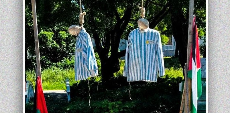 في نهاية هذا الأسبوع، عُلقت دميتان ترتديان قميصين مخططين أزرقين، وعلى صدريهما نجمة داوود، في حديقة بمدينة أوميو. كانت أمامهما، من بين أشياء أخرى، دمية أخرى ترتدي شالاً فلسطينياً، تحمل طفلاً بين ذراعيها، وخلفهما لافتة كُتب عليها “الإبادة الجماعية هي الإبادة الجماعية”.