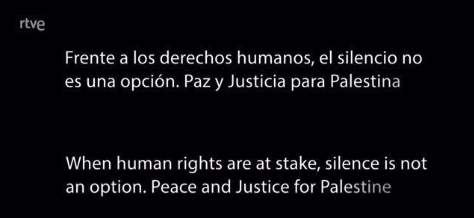 كما بثّ التلفزيون الإسباني رسالة تضامن مع فلسطين خلال نقل فعاليات “يوروفيجن”، جاء فيها: “الصمت ليس خياراً أمام حقوق الإنسان والسلام والعدالة لفلسطين.”