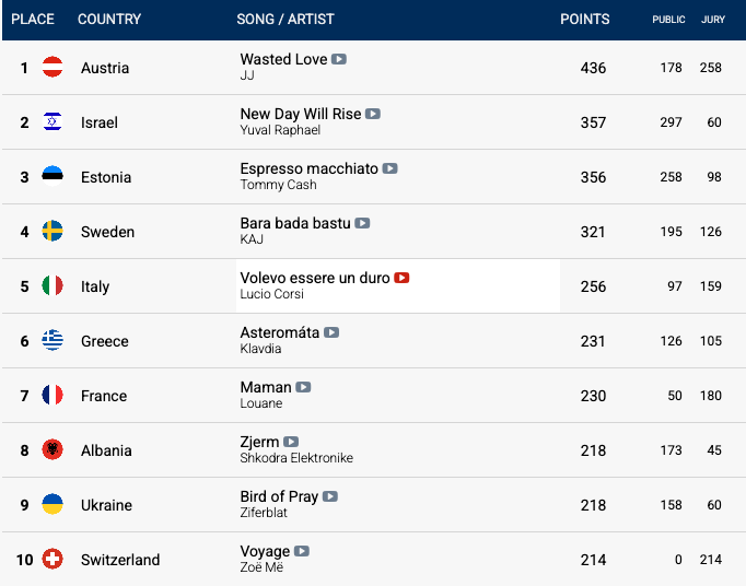 ولم تحظ الأغنية بالـ12 نقطة، وهي أعلى علامة تمنحها لجان التحكيم، إلا في دولة واحدة هي أيسلندا.