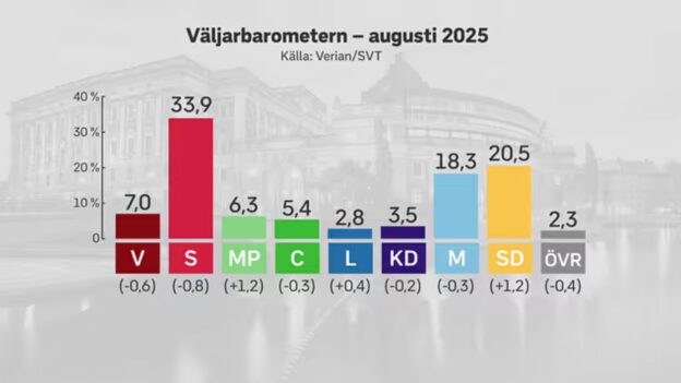 رغم سيطرة عدة قضايا على الأخبار هذا الصيف، مثل الحرب في غزة، وتحركات وزير الهجرة يوهان فورشيل في أوساط اليمين المتطرف، وحرائق الغابات الواسعة في أوروبا، لم تسجل توجهات الناخبين تغيرات كبيرة بالمقارنة مع شهر يونيو، وفقاً لما أكده بير سودربالم، المسؤول عن الاستطلاعات في مركز فيريان.