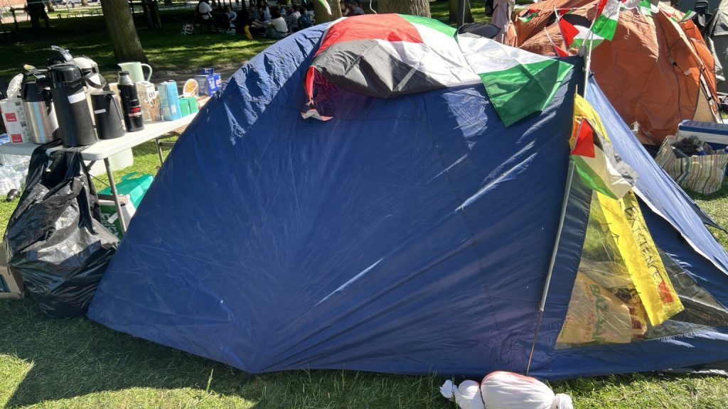 ونصب الطلاب خيامهم على عشب الحديقة ووضعوا لافتات تعبر عن مطالبهم وعن غضبهم من الجامعة.