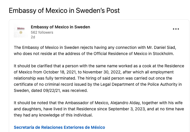 ونفت سفارة المكسيك في منشور على وسائل التوصل أي صله لها به. وقالت إن الرجل واسمه دانيال سياد، لم يسكن إطلاقاً في المكان. ولكنها لفتت إلى أن رجلاً يحمل الاسم نفسه عمل كطاه في المكان قبل إنهاء خدماته عام 2022.