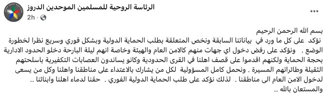 واتهم البيان القوات الأمنية الرسمية بدعم من وصفهم بـ”المسلحين التكفيريين” خلال الاشتباكات بالريف الغربي للسويداء. وجدد الهجري المطالبة بـ”الحماية الدولية وبشكل فوري وسريع نظراً لخطورة الوضع”.