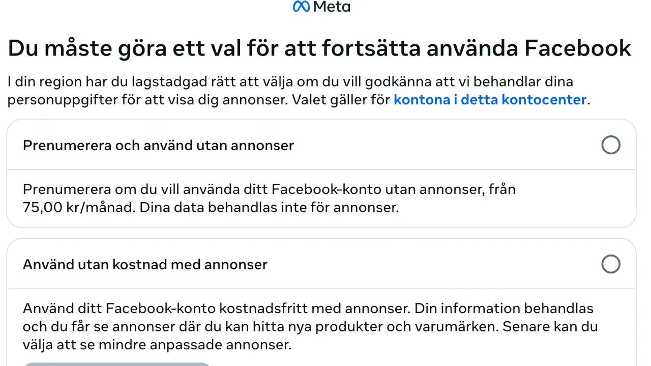 ويُعرض الآن على المستخدمين السويديين خياران إما الدفع مقابل استخدام المنصة بدون إعلانات، أو الاستمرار مجاناً مقابل السماح بجمع البيانات وتوجيه الإعلانات.
