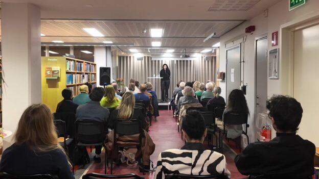 الفعالية نظمها برنامج “Mumin 80 år” مؤخراً بعنوان “مهاجرون يتحدثون” (Flyktingar berättar) في مكتبة كونغسهولمن في ستوكهولم، بالتعاون مع مفوضية الأمم المتحدة لشؤون اللاجئين. وهدفت الفعالية إلى إتاحة المجال أمام المهاجرين واللاجئين لرواية تجاربهم الشخصية وإسماع أصواتهم للجمهور السويدي.