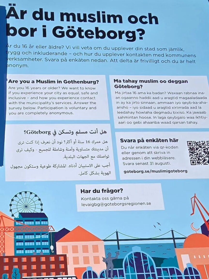 الكومبس – خاص: أطلقت بلدية يوتيبوري استبياناً يهدف إلى جمع آراء المسلمين المقيمين في المدينة. ويهدف الاستبيان إلى “رسم صورة أوضح للإسلاموفوبيا على المستوى المحلي”، وذلك لزيادة الوعي في المدينة وتعزيز جهود مكافحة الإسلاموفوبيا والعنصرية ضد المسلمين، وفق ما جاء في الموقع الرسمي المخصص للإجابة على الاستبيان.